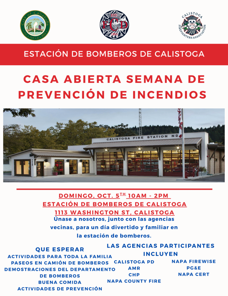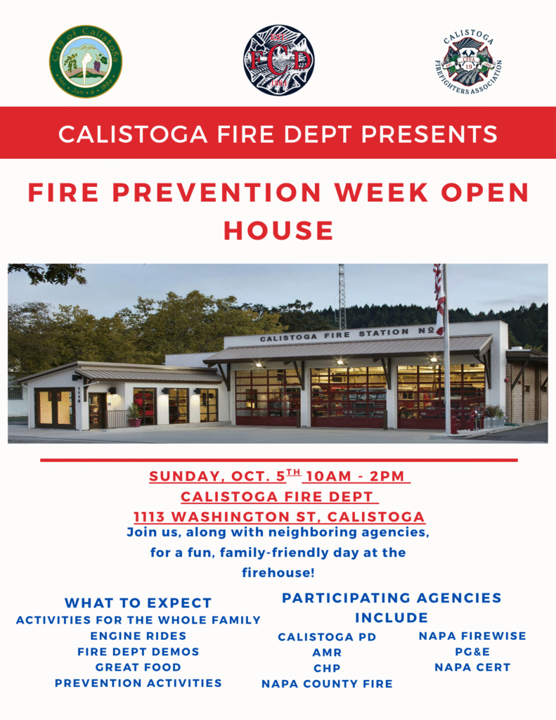 Join the Calistoga Fire Department, Fire Department Association, and City of Calistoga for their Fire Prevention Week Open House. Calistoga Fire has activities for the whole family to enjoy including engine rides, demonstrations, fire prevention activities, food, and more.
